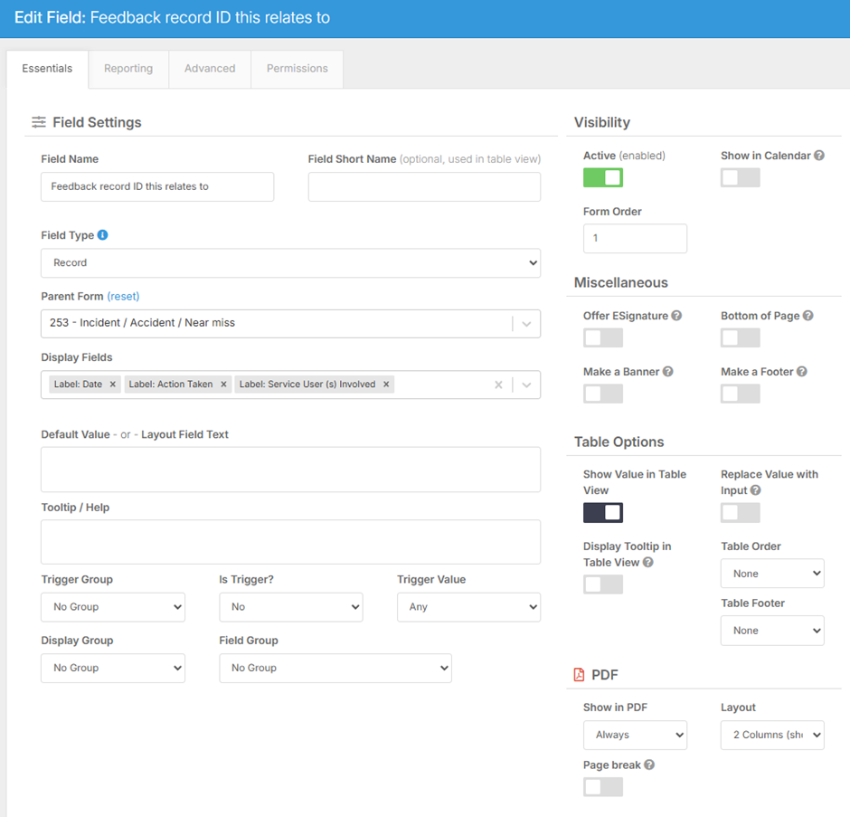 - If the child form is not in the same section as the parent form, the ‘record ID field’ of every record will appear. There are some filters that can be applied to mitigate this (status, expiration, permissions)